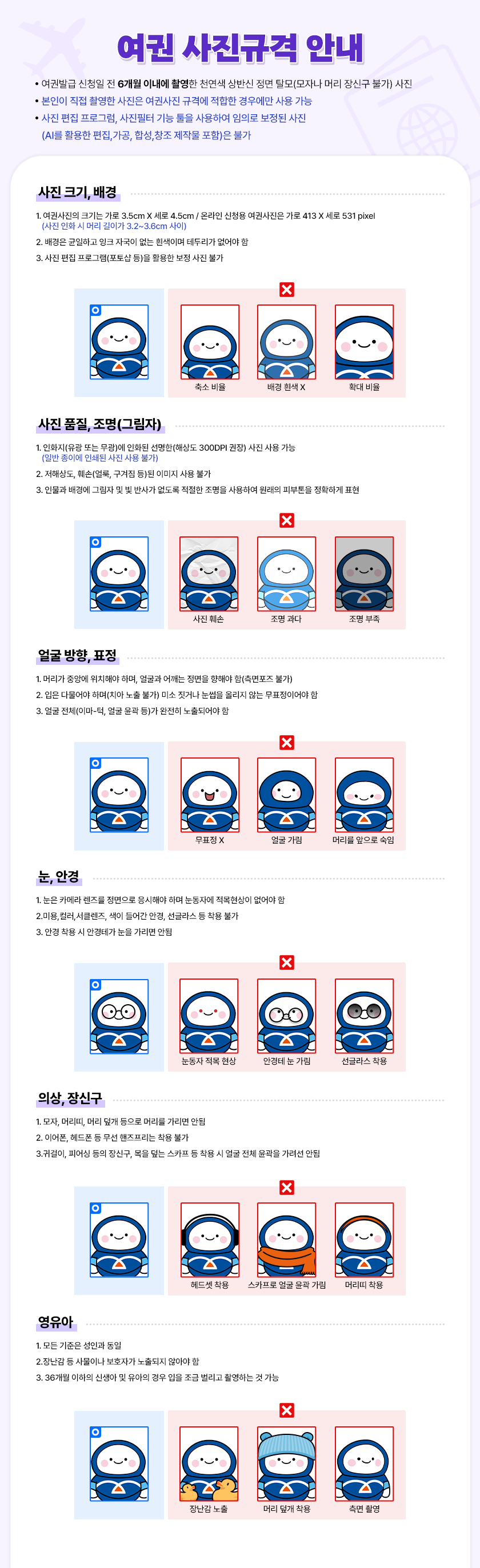 사진은 6개월 이내에 촬영한 사진이어야 하며, 귀와 눈썹이 보이도록 찍어야 합니다.