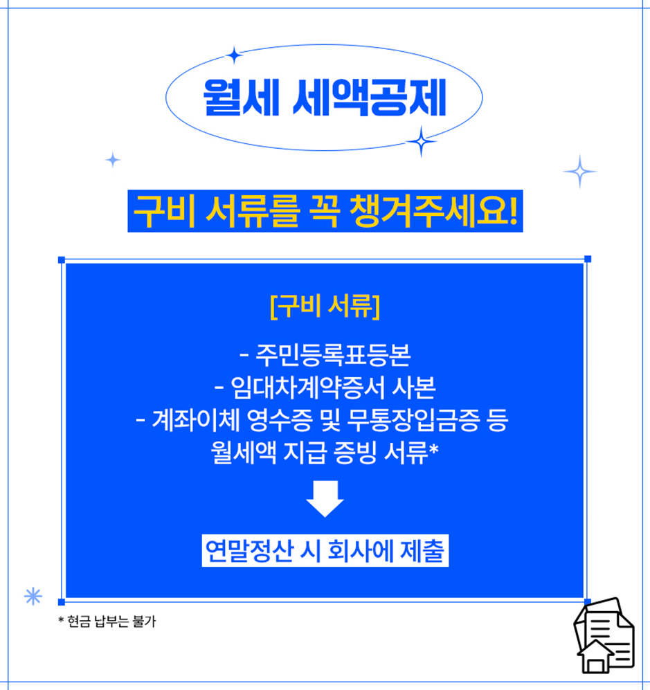 * 주택 관련공제: 월세 세액공제, 주택청약종합저축 소득공제, 주택임차자금 차입원리금 공제 등