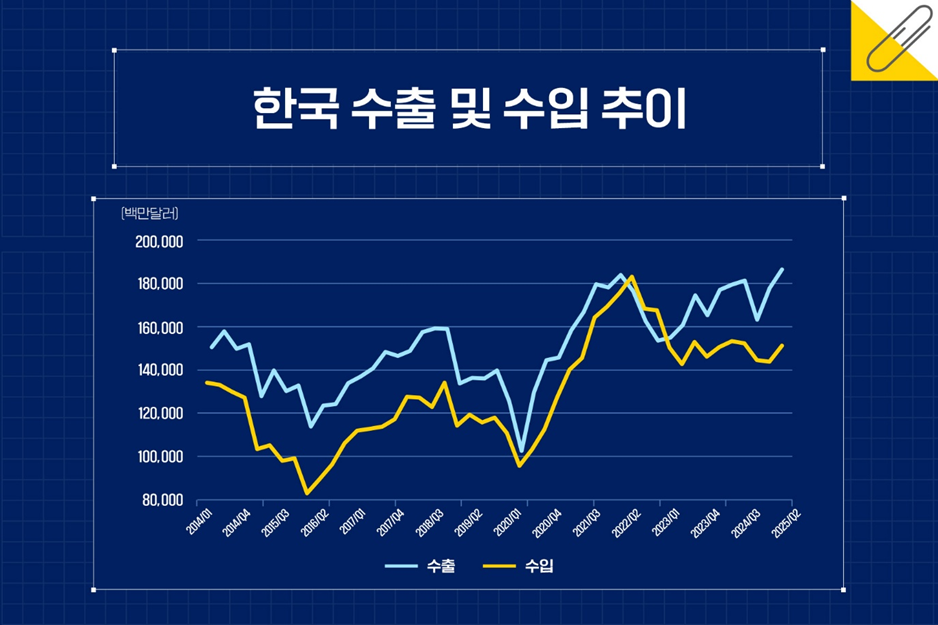 아래 그래프에서 보는 바와 같이 2014년 이후 우리나라의 수출과 수입을 비교해 보면 무역수지가 흑자를 보였다. 한국이 수출로 번 외화가 수입으로 지급한 외화보다 많아 우리나라의 외환시장에 유입되는 외화 규모가 유출 규모보다 크기 때문에 이것만 보면 외환시장에서 외화의 가치는 하락하는 것이 당연하고 원/달러 환율은 하락했어야 했다.