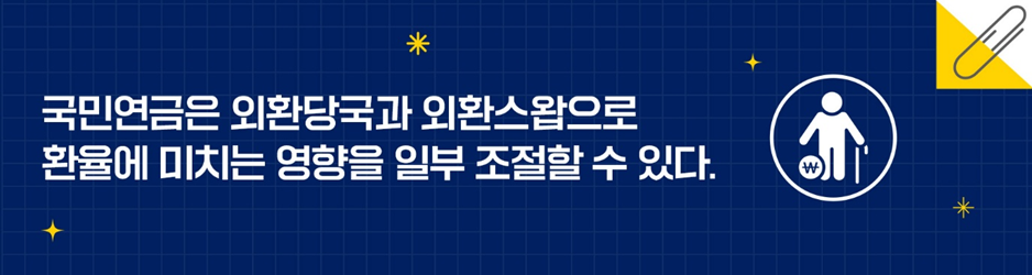 여기서 한 가지 환율에 미치는 영향을 분석함에 있어 유의할 점이 있다. 국민연금의 경우 대외자산 투자 시 외환시장에 영향을 덜 주기 위해 외환당국(한국은행, 기획재정부)으로부터 직접 달러를 매입할 수 있는 외환스왑*을 할 수 있어 상대적으로 외환시장에 주는 충격을 줄일 수 있다.