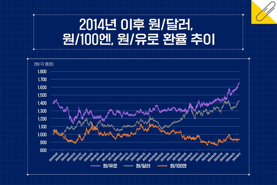 최근 원/달러 환율이 1,460∼80원대를 유지하면서 과거와 다르게 이례적으로 높은 수준을 유지하고 있다. 원/유로 환율도 함께 상승하였다. 다만, 원/100엔 환율은 그렇지 않다.* 원/달러, 원/유로 환율이 상승한다는 것은 원화의 가치가 그만큼 하락하고 있다는 의미이다. 아래 그림은 2014년 이후 각각의 환율 추이를 보여주고 있다.